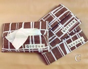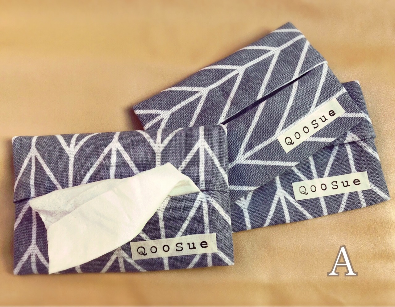 QooSueのロゴが入った、縫い目の見えないスタイリッシュなデザインのポケットティッシュカバー。3種類あります。